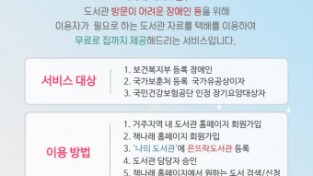 구립 은뜨락도서관, 장애인 위한 도서 택배 대출 서비스 ‘책나래’ 운영‘책을 품은, 열린 지식·문화공간’ 구립 은뜨락도서관(관장 김명수)은 국가 상호대차 서비스, 장애인을 위한 도서 택배 대출 ‘책나래’를 지속해서 운영한다고 29일 밝혔다. 책나래 서비스란 도서관 방문 이용이 어려운 장애인에게 우체국 택배를 이용해 도서관 자료(도서 등)를 무료로 집까지 배달 및 수거해주는 서비스이다. 지원 대상은 보건복지부 등록 장애인뿐만 아니라 국가보훈처 등록 국가유공자이자 국민건강보험공단 인정 장기 요양대상자도 무료로 이용할 수 있다. 책나래 서비스를 이용하고 싶은 분들은 은뜨락도서관과 책나래 홈페이지에 회원가입을 마친 후 책나래 홈페이지에 있는 ‘나의 도서관’에 은뜨락도서관을 등록해야 하면 된다. 도서관 담당자 승인 이후에 책나래 홈페이지에서 도서를 검색 및 신청하면 우체국 택배로 집까지 배달된다. 더불어 은뜨락도서관에서는 서울시 은평구 관내에 있는 장애인들의 독서 능력 향상 및 도서 이용 활성화를 위한 적극적인 정보 서비스인 ‘책 추천해드림’도 운영 중이다. 책 추천해드림은 책나래 회원 중 메일 수신 동의자에게 은뜨락도서관의 신간 도서 목록을 발송하는 서비스이며, 매월 첫 번째 화요일에 발송된다. 구립 은뜨락도서관 담당자는 “책나래 서비스를 통해 독서 소외계층이 필요한 자료를 편리하게 이용할 수 있도록 더욱 노력하겠다”고 말했다. 자세한 사항은 은뜨락도서관 전화 문의 또는 도서관 홈페이지를 통해 확인할 수 있다. 언론연락처: 은뜨락도서관 정슬기 02-389-7635(내선 211) 이 뉴스는 기업·기관·단체가 뉴스와이어를 통해 배포한 보도자료입니다. -